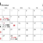 . 【10月カレンダー】 6日(月)ランチ休み、ディナー営業 12日(日)...